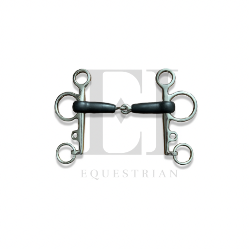 This pelham bit features single jointed mouthpiece crafted from rubber with German stainless steel accents.